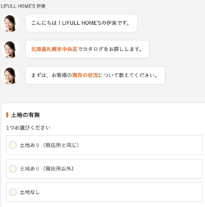 エリアを選ぶと中の人とのチャットが始まりますので、順番に答えていきます。最後に住所などの情報を入力して送信ボタンを押すだけです。